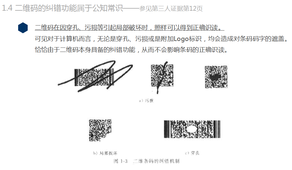 最后,關(guān)于二維碼的成功,以至于成為當(dāng)今商業(yè)社會(huì)最為重要的流量入口,這一方面要?dú)w功于二維碼本身加入了Reed-Solomon糾錯(cuò)算法,為其廣泛傳播奠定了基礎(chǔ);另一方面則要?dú)w功于國(guó)家的高度重視,以及騰訊、阿里等互聯(lián)網(wǎng)科技公司所做出的不懈努力。然而,這與涉案專利并無(wú)關(guān)聯(lián)。